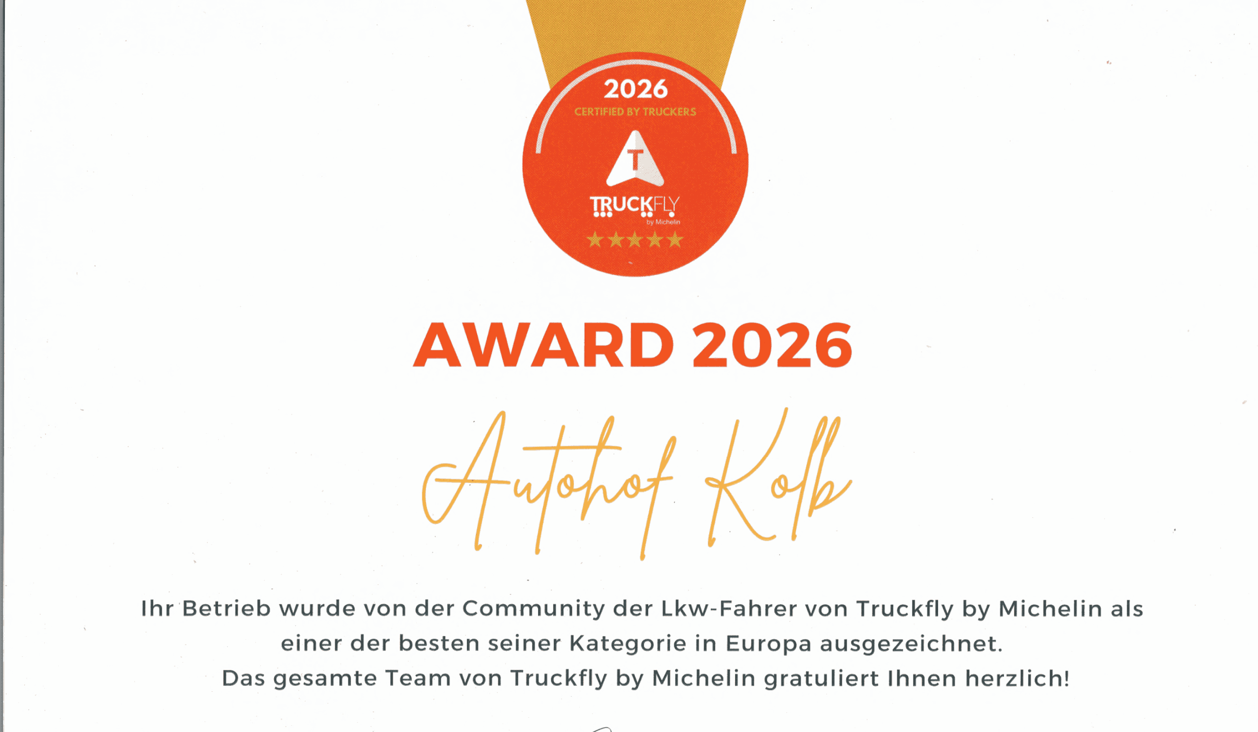 Der Autohof Kolb wurde 2026 von der internationalen Fahrer-Community von Truckfly by Michelin als einer der besten Truck Stops in Europa ausgezeichnet.