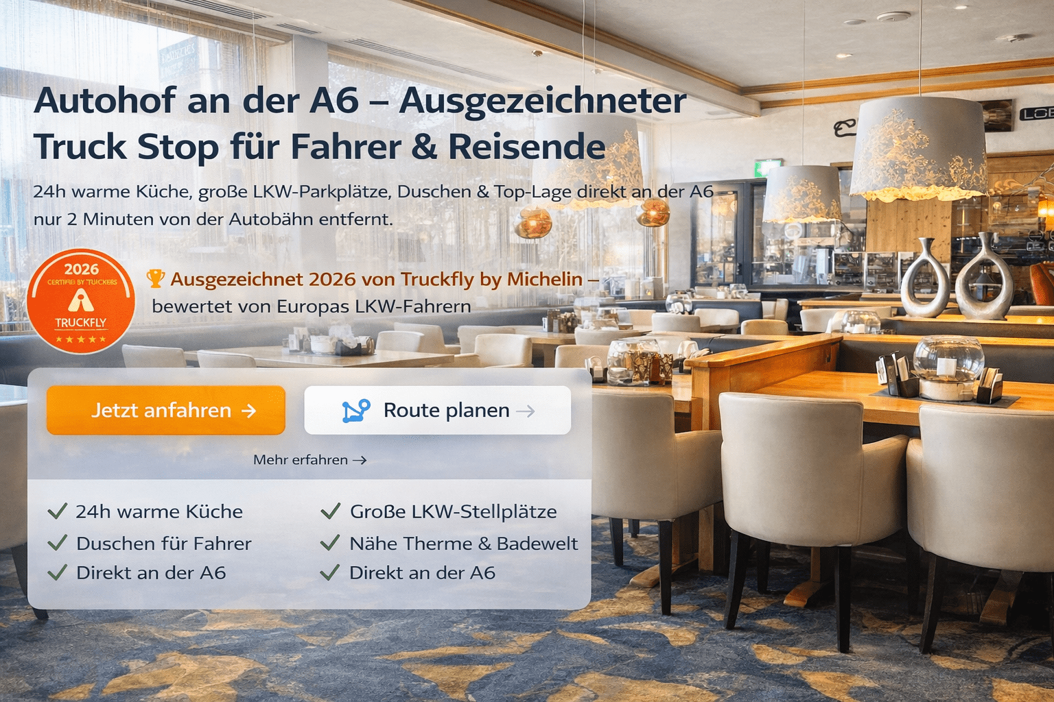 24h warne Küche, große LKW-Parkplätze, Duschen & Top-Lage direkt an der A6.